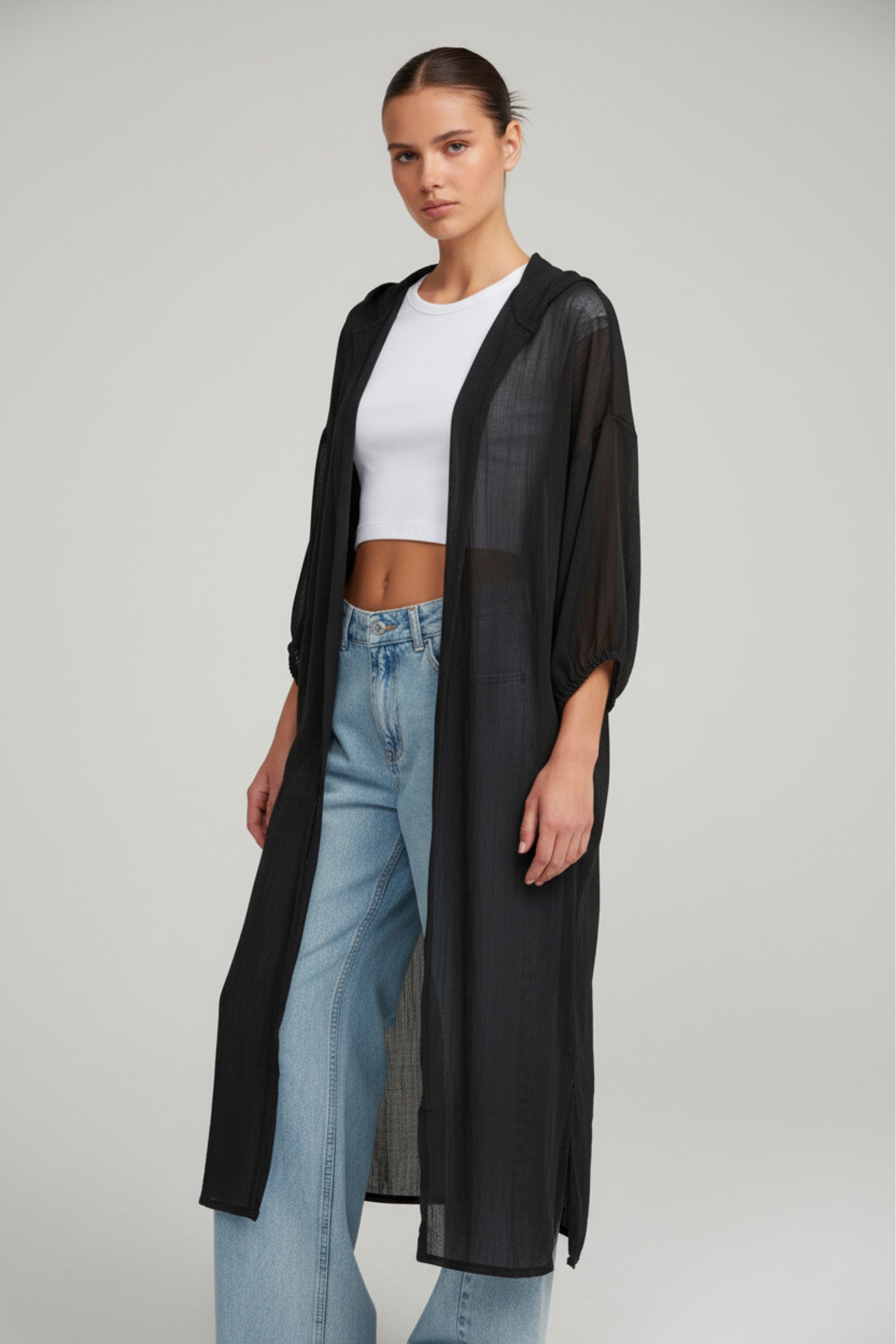 Capa translúcida en color negro con capucha y bolsillos funcionales. Una prenda ligera que envuelve sin ocultar, perfecta para superponer y elevar cualquier look. Su acabado etéreo aporta movimiento y misterio, mientras que el diseño práctico la convierte en una aliada ideal para las tardes de verano o noches suaves.