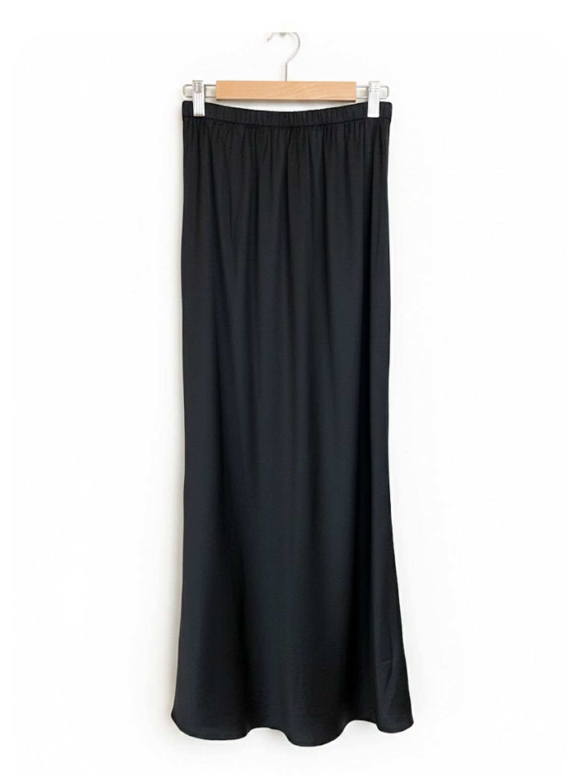 Falda larga de satín con caída fluida que acompaña el movimiento con suavidad y elegancia. Su silueta limpia y ligeramente evasé estiliza la figura mientras el tejido satinado refleja la luz con un brillo delicado. El tono profundo aporta sofisticación y versatilidad, convirtiéndola en una pieza atemporal que puede combinarse fácilmente con blusas ligeras o tops de satín para un look refinado y luminoso.