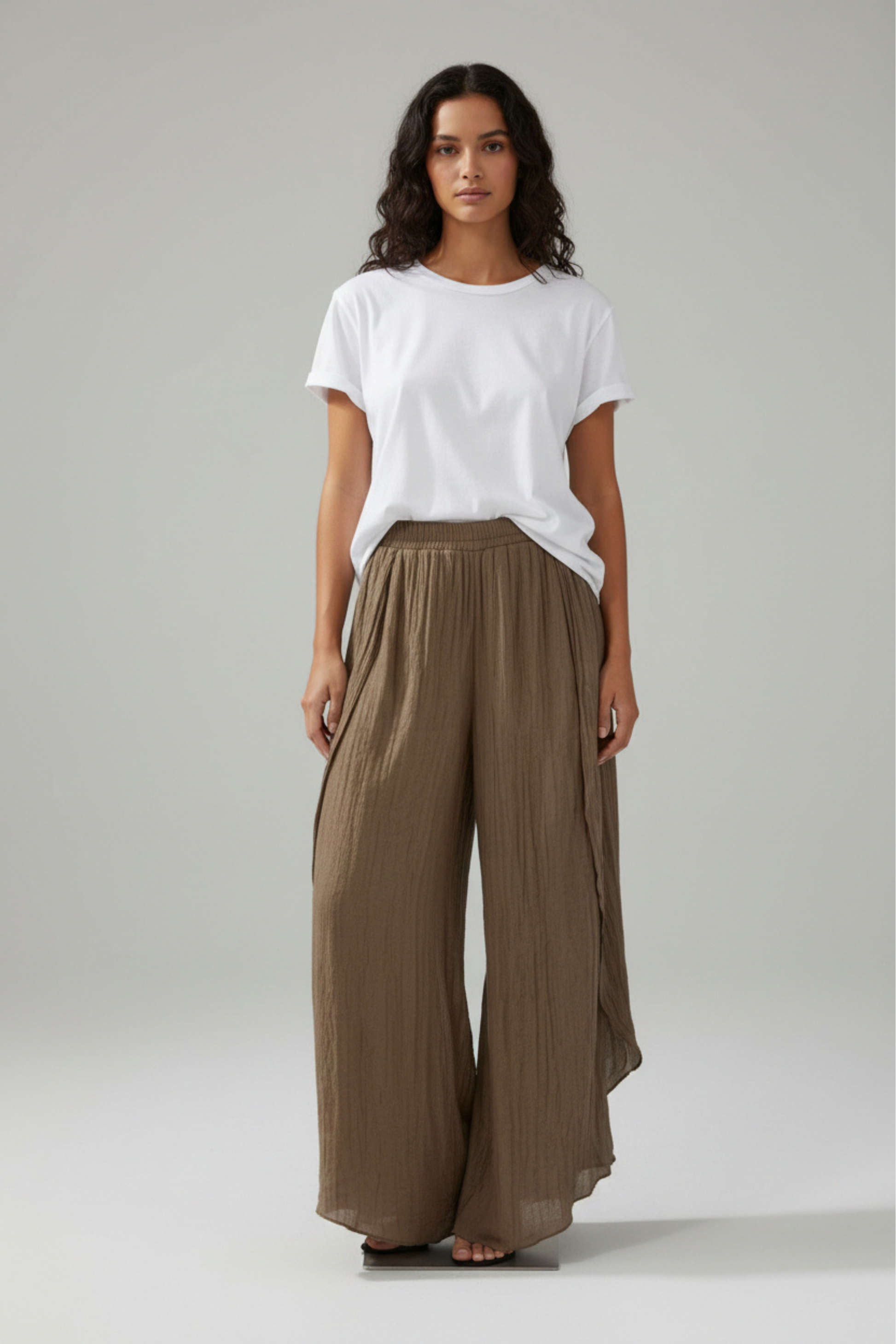 Palazzo abierto en tejido translúcido que aporta movimiento y ligereza a cada paso. Una prenda fluida y sofisticada, pensada para superponer y jugar con las capas, ideal para elevar un look sencillo y acompañarte del día a la noche con naturalidad. Con resorte en la cintura que se adapta a todo tipo de cuerpo.