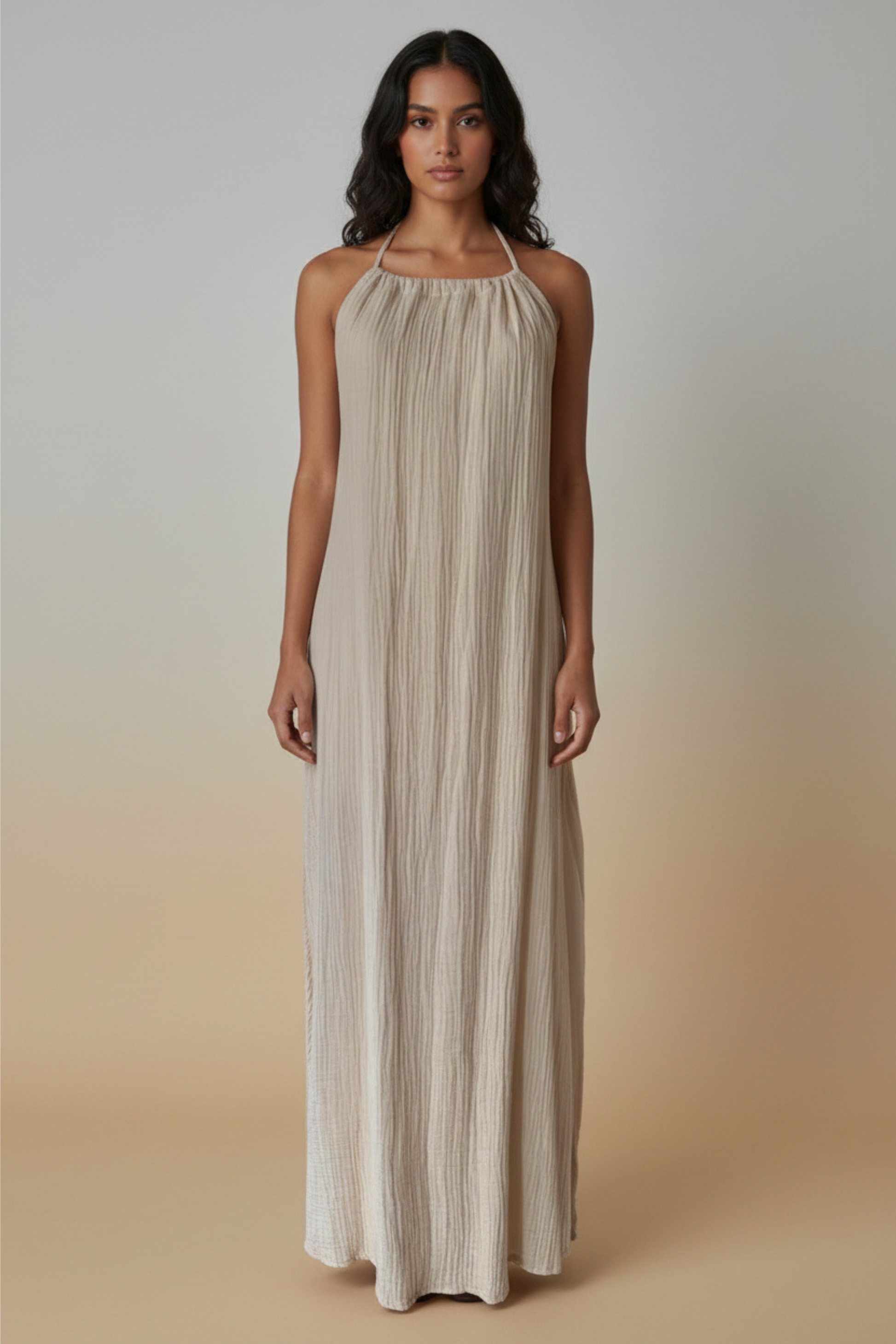 Vestido de algodón con amarre al cuello, de silueta ligera y cómoda. Su diseño deja los hombros al descubierto y aporta un aire relajado y femenino, perfecto tanto para paseos de día como para cenas de verano. Una prenda fácil de llevar, versátil y pensada para acompañarte toda la temporada.
