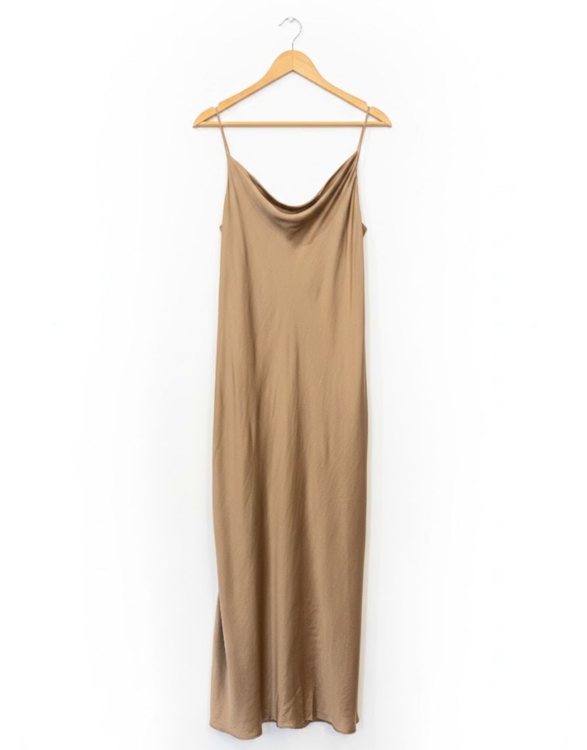 Vestido largo de satín con caída fluida y tacto sedoso que acompaña el movimiento del cuerpo con naturalidad. Su escote suave y tirantes delicados crean una silueta limpia y femenina, mientras el tono cobre aporta una luminosidad cálida que resalta la piel bronceada.